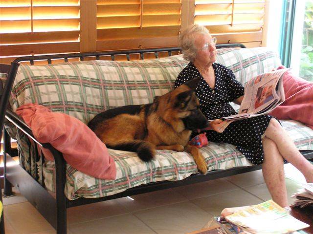 Kieserhund Gracious Lady (Chaya) with her mum Beth catching up on the news